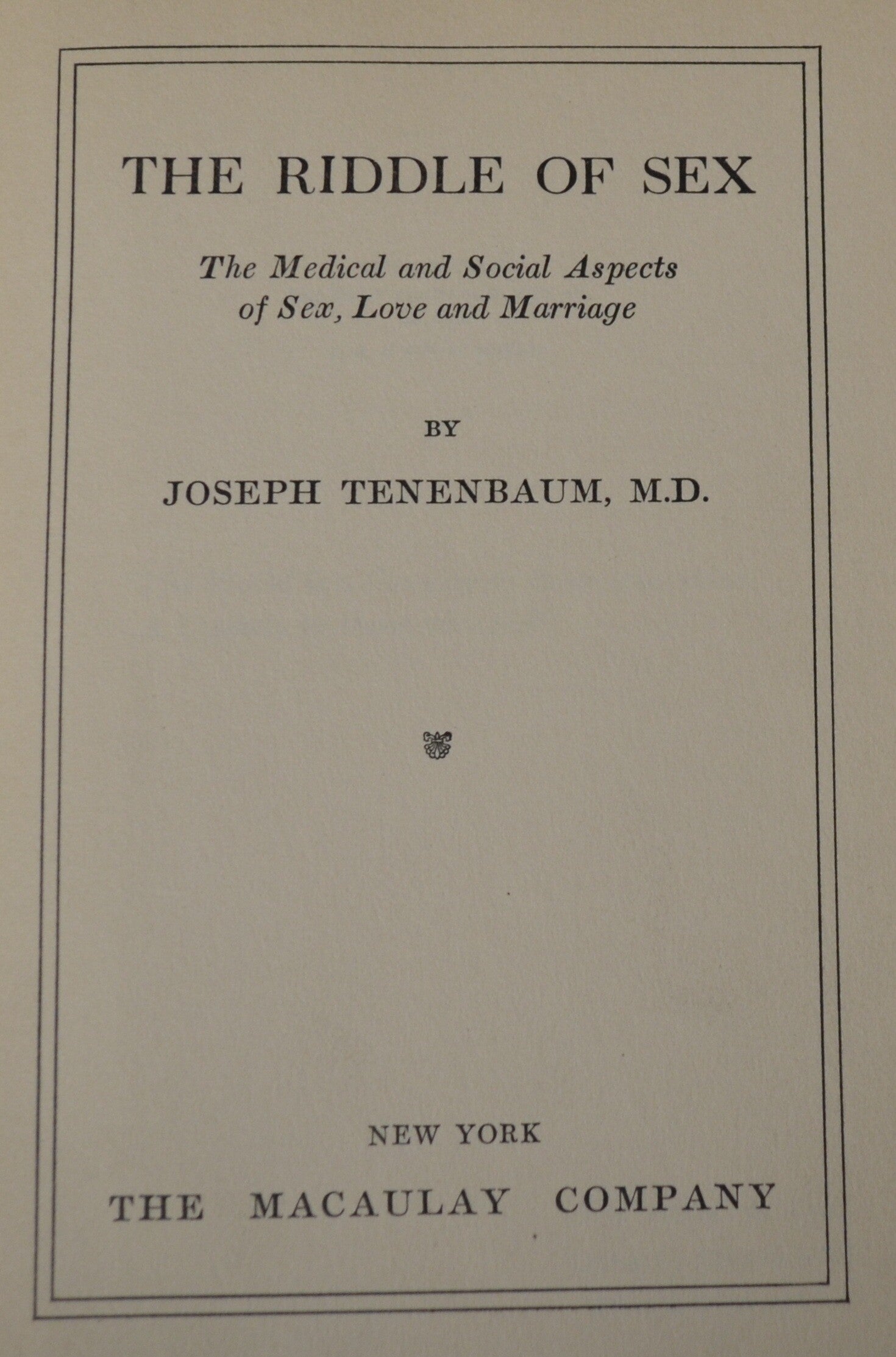 Year Published: 1929 Author: Joseph Tenenbaum, M.D. Edition: First Edition Cover: cover Publisher: Macaulay Company Condition: Good Special Note: Must be 18+ to buy - NO SALE TO MINORS ISBN: None