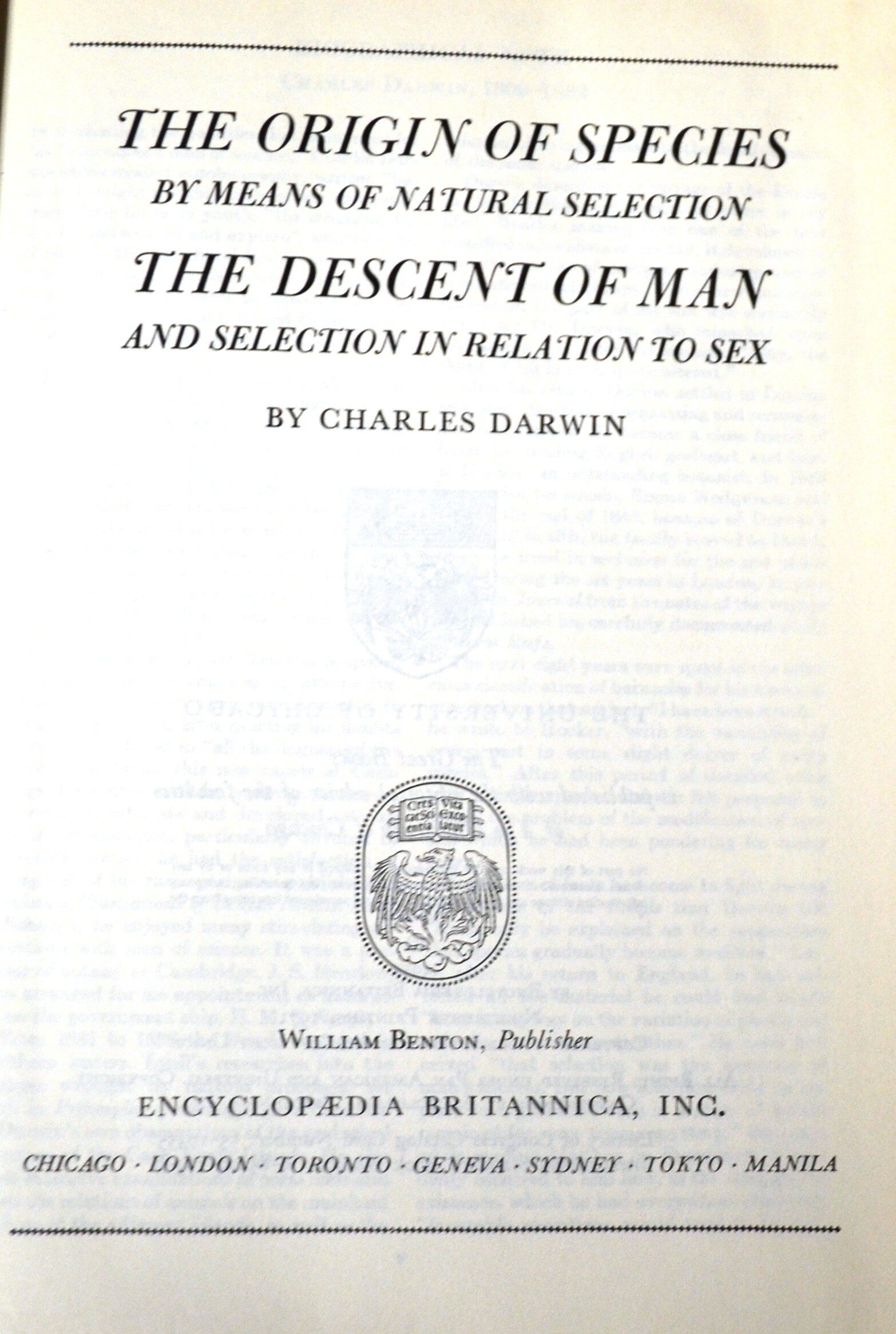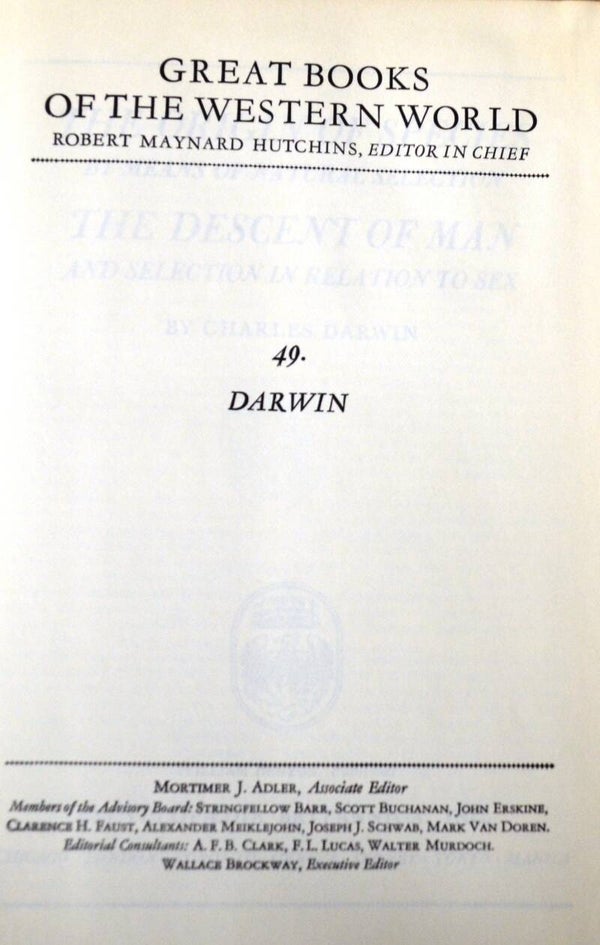 Year Published: 1952Author: Charles DarwinEdition: 1971 Nineteenth PrintingCover: HardcoverPublisher: Encyclopedia Britannica, Inc.Condition: Very GoodISBN: None