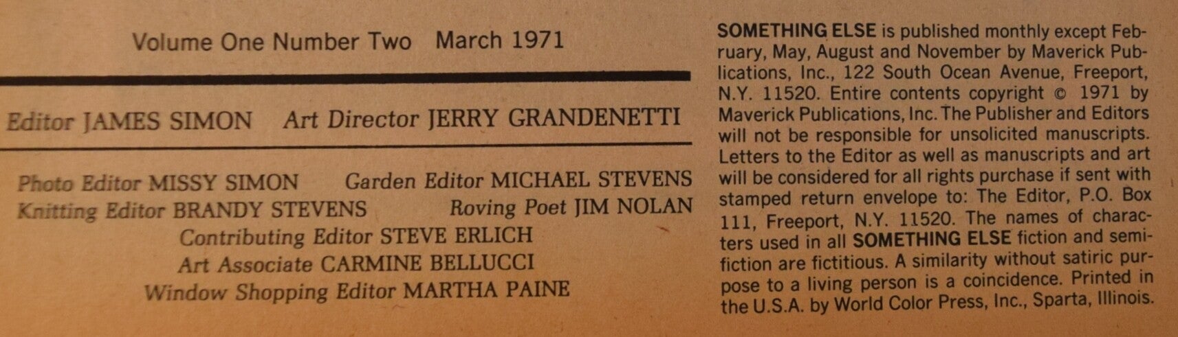 Year Published: 1971Author: No AuthorEdition: First Edition - March - Volume 1 Number 2Cover: Softcover MagazinePublisher: Something Else Magazine Condition: GoodISBN: None